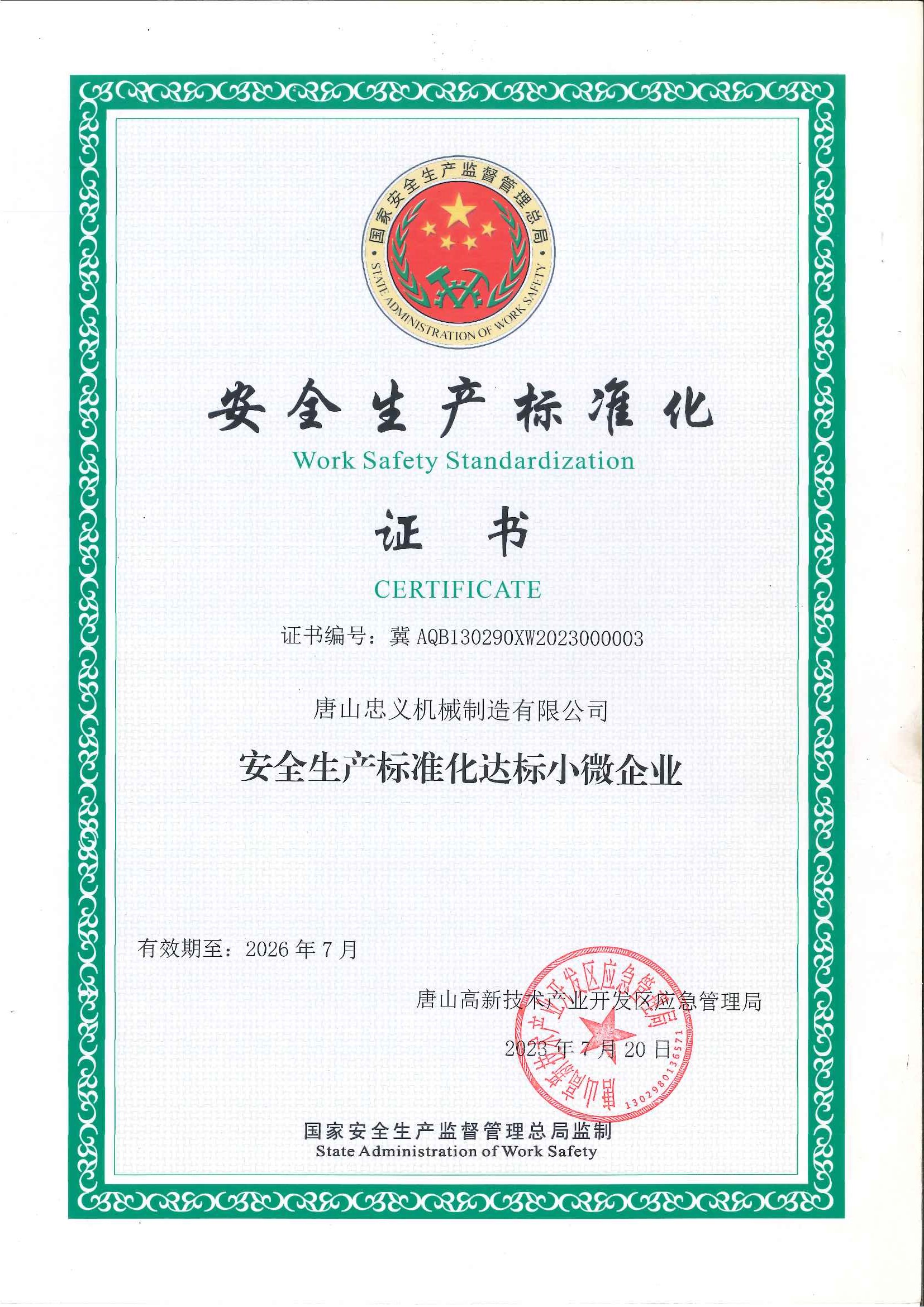 安全生產標準化證書新